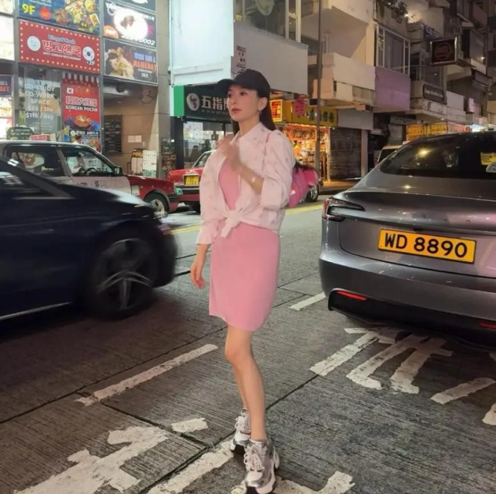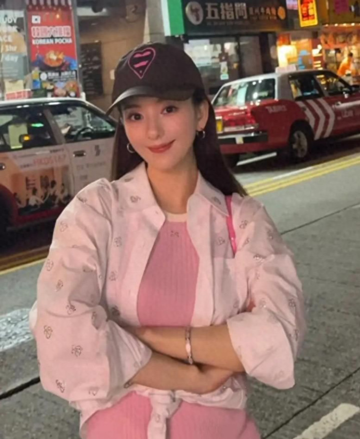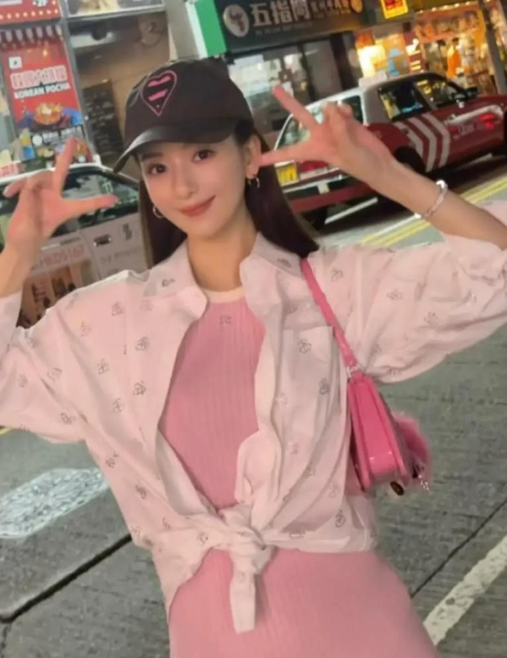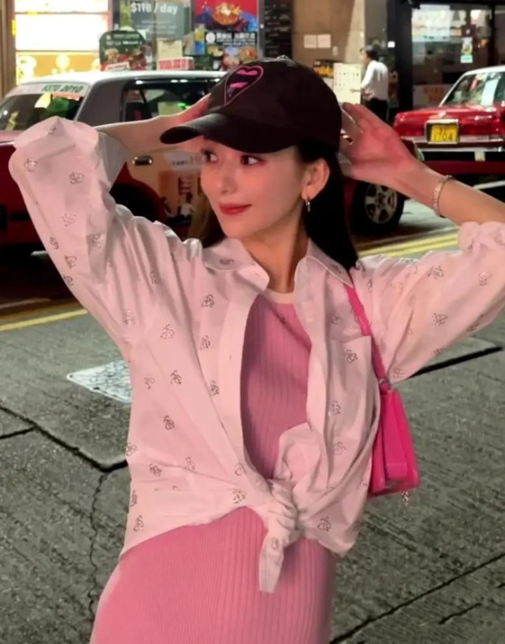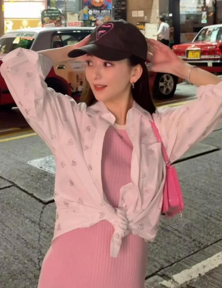 她当时戴着一顶黑色的鸭舌帽,身穿一件粉色的连衣裙,搭配一件白色的长衬衫,衬衫上规则的遍布着图案。
